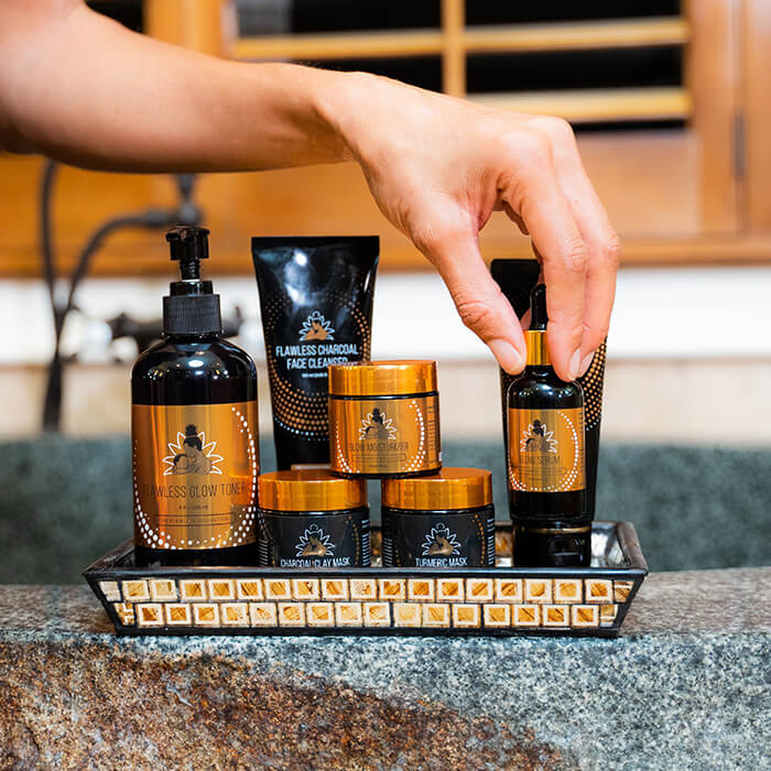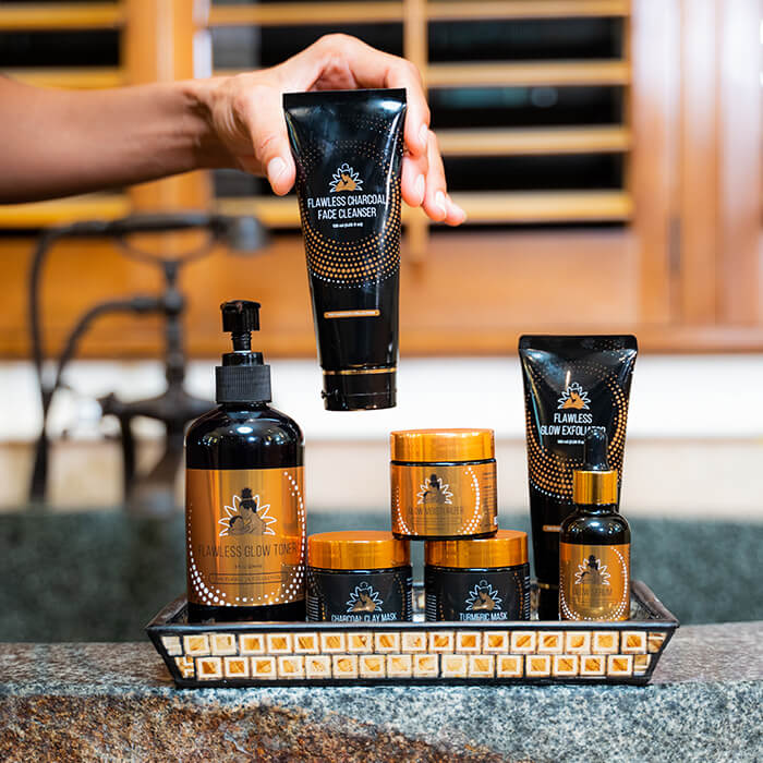 Optional MASK: As needed, Apply Flawless Charcoal Face Mask to remove impurities or Flawless Turmeric Mask for an extra glow, leave on for 15 minutes and then moisten the skin for removal. Follow with Flawless Glow Toner.