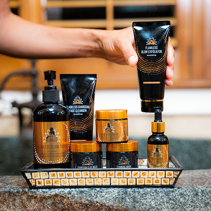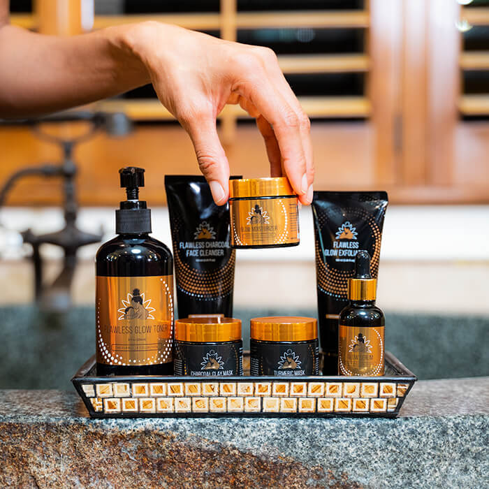 Optional MASK: As needed, Apply Flawless Charcoal Face Mask to remove impurities or Flawless Turmeric Mask for an extra glow, leave on for 15 minutes and then moisten the skin for removal. Follow with Flawless Glow Toner.