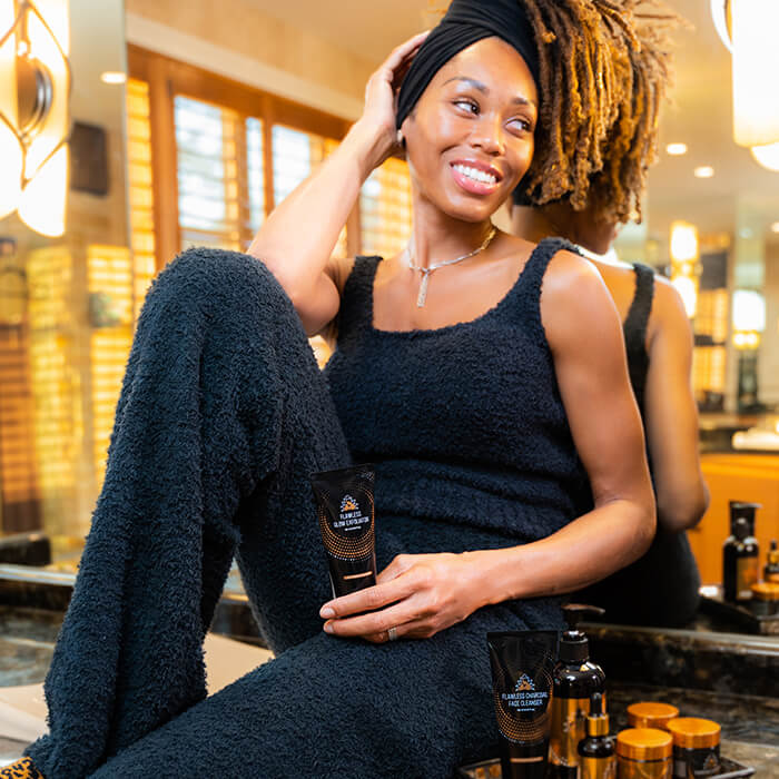 Flawless Charcoal Face Cleanser- Take deep cleaning to another level. Infused with activated coconut charcoal, aloe, lavender essential oil and more, our cleanser purifies the skin by removing toxins and creates a barrier of protection, leaving your skin soft and smooth